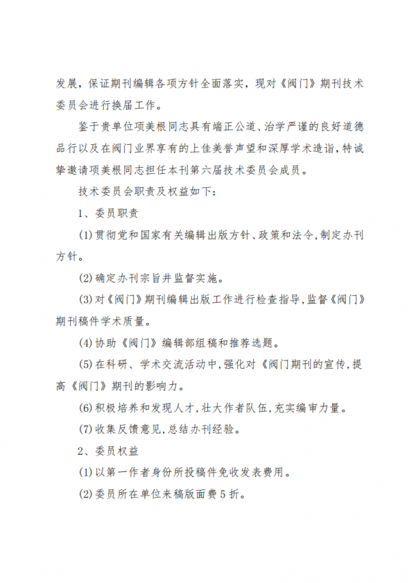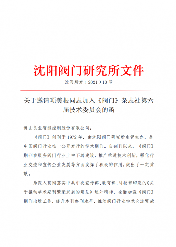 文章詳情接2021年11月1日《閥門》雜志社邀請函:鑒于黃山良業(yè)項美根先生具有端正公道、治學(xué)嚴(yán)謹(jǐn)?shù)牧己玫赖缕沸幸约霸陂y門業(yè)界享有的上佳美譽聲望和深厚學(xué)術(shù)造詣,特誠摯邀請項美根同志擔(dān)任本刊第六屆技術(shù)委員會成員。
