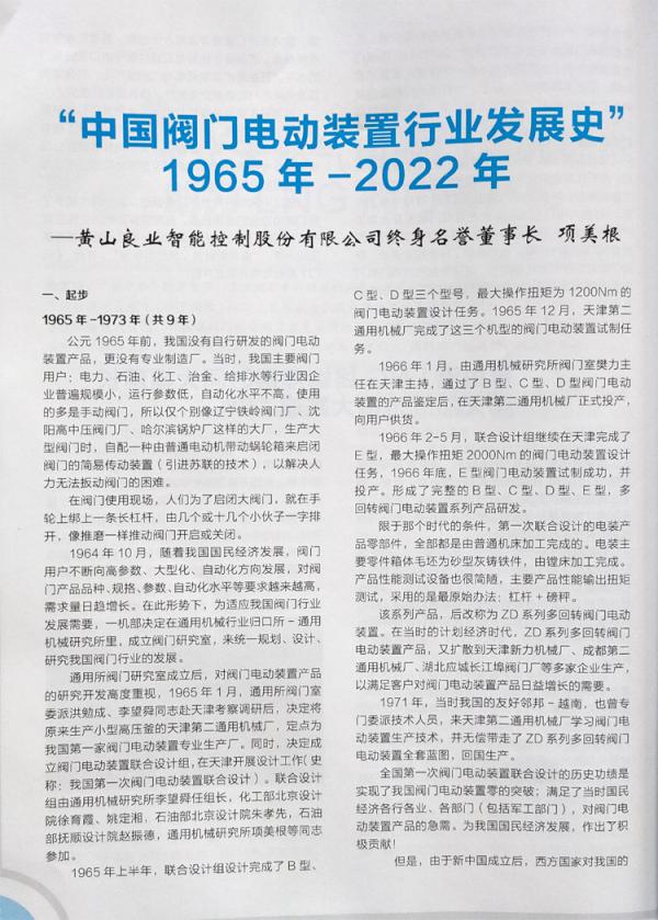 文章詳情由黃山良業(yè)項美根名譽董事長撰寫的論文《中國閥門電動裝置行業(yè)發(fā)展史——1965-2021》繼2021年2月、4月在《閥門用戶》發(fā)表后,在業(yè)內(nèi)產(chǎn)生強烈的反響。之后《中國通用機械》雜志也選用該論文,并連續(xù)刊登在2021年12月第6期,2022年第1、2期上。近日又被《閥門》雜志社選用刊登在《閥門》雜志2022年第3期上,讓更多的讀者了解我國閥門電裝的發(fā)展歷程,并提供豐富的珍貴歷史資料。