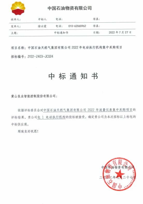 文章詳情2022年7月27日,我公司收到中國石油物資有限公司的《中標通知書》,成功中標中國石油天然氣集團有限公司2022年電動執(zhí)行機構(gòu)集中采購項目包1:電動執(zhí)行機構(gòu),中標金額480.9萬元,執(zhí)行周期自采購結(jié)果公告之日起至 2023 年9 月30 日。