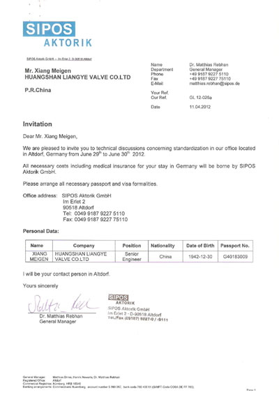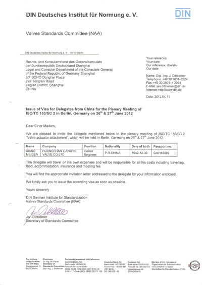 【導(dǎo)讀】黃山良業(yè)閥門有限公司董事長(zhǎng)項(xiàng)美根應(yīng)邀出席德國(guó)柏林召開的國(guó)際閥門標(biāo)準(zhǔn)化會(huì)議,目前已收到din標(biāo)準(zhǔn)化組織發(fā)來的邀請(qǐng)函(valvesstandardscommittee)。黃山良業(yè)閥門有限公司是國(guó)內(nèi)著名的閥門電動(dòng)裝置生產(chǎn)企業(yè),由我國(guó)第…
