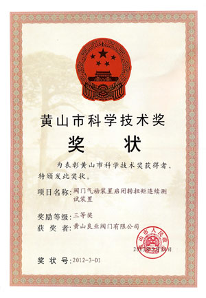 泵閥交易網(wǎng)訊 黃山良業(yè)閥門有限公司研制的“閥門氣動裝置啟閉轉(zhuǎn)矩連續(xù)測試裝置”因其有多項技術創(chuàng)新和國家專利,并經(jīng)用戶使用證明具有良好的市場前景,最近經(jīng)黃山市科技局評審,榮獲2011-2012年度黃山市科學技術進步三等獎證書。
