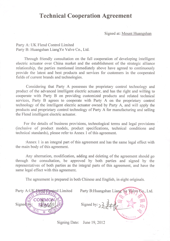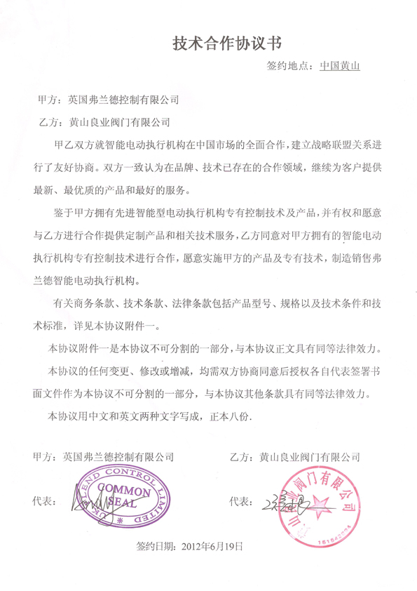 文章詳情鑒于英國(guó)弗蘭德控制公司(UK Flend Control Limited)擁有世界先進(jìn)水準(zhǔn)的智能型電動(dòng)執(zhí)行機(jī)構(gòu)專有控制技術(shù)及產(chǎn)品,黃山良業(yè)閥門有限公司又有良業(yè)的電動(dòng)執(zhí)行機(jī)構(gòu)研究、開發(fā)與制造歷史與記錄。經(jīng)雙方洽談,黃山良業(yè)閥門有限公司和英國(guó)弗蘭德控制公司最近正式簽訂了智能型電動(dòng)執(zhí)行機(jī)構(gòu)在中國(guó)市場(chǎng)的全面合作協(xié)議。雙方一致認(rèn)為在品牌、技術(shù)方面,已存在良業(yè)的的合作領(lǐng)域。決心繼續(xù)為客戶提供最新、最優(yōu)質(zhì)的產(chǎn)品和最好的服務(wù)。英國(guó)弗蘭德控制公司同意對(duì)黃山良業(yè)閥門有限公司的智能型電動(dòng)執(zhí)行機(jī)構(gòu)專有控制技術(shù)進(jìn)行合作,黃山良業(yè)閥門有限公司愿意實(shí)施英國(guó)弗蘭德控制公司的產(chǎn)品及專有技術(shù),制造銷售弗蘭德智能型電動(dòng)執(zhí)行機(jī)構(gòu)。此次技術(shù)合作,為黃山良業(yè)閥門有限公司今后的發(fā)展進(jìn)一步奠定了基礎(chǔ)。